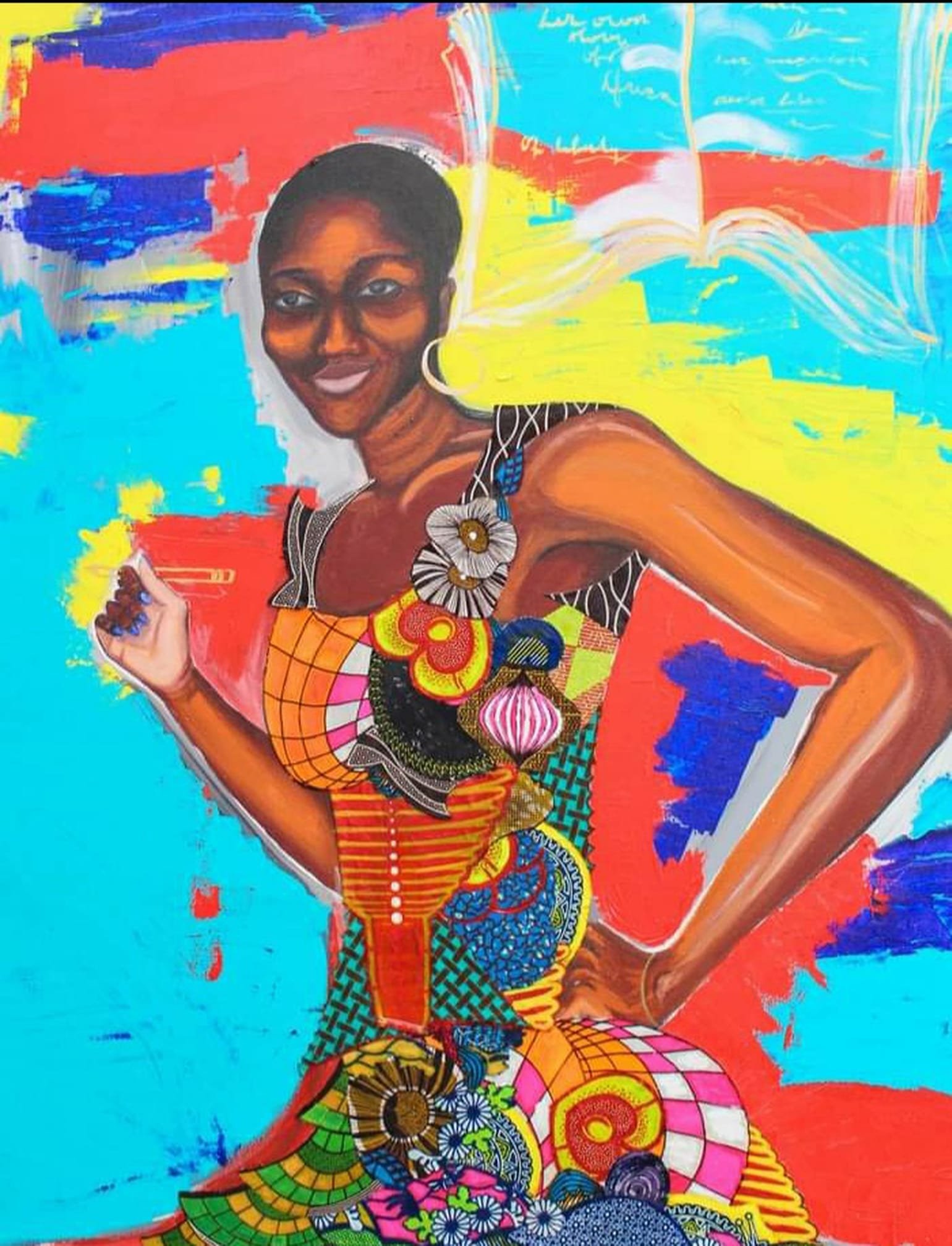 a collective celebration of our mothers and grandmothers, of the elegance, grace, and powerful presence of Black women in a romanticized past that empowers and comforts us. This painting uses the reference photo of my mother from 1965 to suggest the larger context of Black women’s history in the 20th century. In addition to the joyful response I’ve witnessed Black people have to this painting, Black women of a certian era… is also an outlet for collective grief because it deals with memory, the passage of time and the idea of inevitable loss. This piece was a part of the group show Avant Garde at the Thinker Maker Society, 2022, and as a part of the group show Divine Feminine Energy: Honoring our Mothers, at Ultra Silk Gallery, 2023. Both galleries are in Philadelphia.